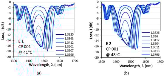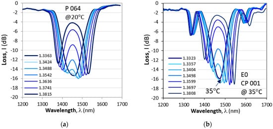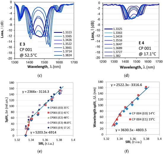 These results indicate that the highest sensitivity to temperature is observed at the TAP, which is important in the case of SRI sensing applications in which temperature stability must be maintained. As seen from Table 5 the temperature sensitivity varies between ≈12 nm/°C and ≈18 nm/°C theoretically at the TAP. As the gratings are used slightly after split, we assume that a meaningful value of 10 nm/°C and an instability of 0.1 °C would lead to a 1 nm fluctuation of the reading of the wavelength split, which will lead to an uncertainty of the SRI determination of 1/Sn. For an average value Sn ≈ 4135 nm/r.i.u. (see Figure 9b) the SRI uncertainty would be ≈2.4 × 10−4. If the accuracy of wavelength shift determination is 0.1 nm, then the SRI uncertainty would be ≈2.4 × 10−5, which would require a temperature stability of 0.01 °C. Based on our experience in biosensing with DR LPGs [23,24], to ensure such a stability in SRI-based sensing applications, the following measures are recommended: perform the measurements in premises with temperature control and avoiding air flows; place the sensing grating in a massive and thermally isolated housing, ensuring a cover for the sensing area with a small volume around the grating in the liquid container; after changing the concentration of the liquid, wait for several minutes for the temperature to stabilize and vapors to saturate.