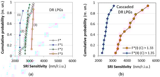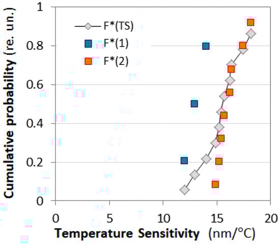With reference to Table 5, and Figure 15 we present a plot of the cumulative probability F*(TS) of the sensitivity to temperature around TAP temperature. The average sensitivity is ST,avg ≈ 15.28 nm/°C, but we clearly see two subpopulations with cumulative functions F*(1) and F*(2) whose mean values are 12.97 nm/°C and 16.15 nm/°C. Thus, we see that most of the C DR LPGs (73%) are well grouped around 16.15 nm/°C. The gratings from the second subpopulation centered around 12.07 nm/°C are among the subpopulation of higher sensitivity to SRI listed in Table 1 and Figure 9b.