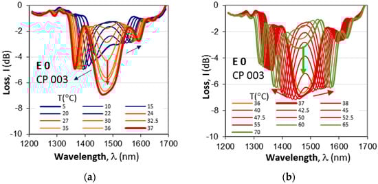 We now consider the temperature responses of the cascaded LPGs and first note that in Figure 8, the responses to SRI changes at higher temperatures (Figure 8a–c) are deeper (around −17 dB) compared to the same responses at lower temperatures (17.1 °C). As the number of temperatures is about 20, we present the evolution in two stages: at lower and at higher temperatures. Figure 10a presents the results for CP 003 for temperatures from 5 °C, at which the spectra were already lightly split, until the first split at 37 °C. As is seen, under 30 °C, the depth of the cascaded DR LPG is between −3 dB to −5 dB, after which it drops to −7 dB as evidenced in Figure 10a,b.