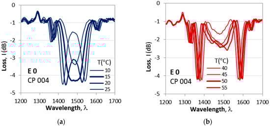 Cascaded DR LPG CP 004 exhibits somewhat different behavior. The first observed split at 15 °C (Figure 11a) is deeper (−4.2 dB) compared to the next one at 50 °C (−2.3 dB) shown in Figure 11b, as summarized in Table 2.