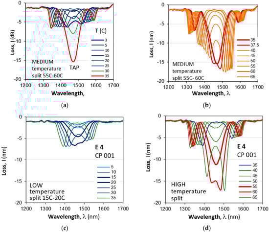 Temperature-induced evolution of the spectra of a C DR LPG CP 001 prior to etching (E0) and after 4th etching (E4): (a) a medium temperature split before etching at the extremity of the 5 °C–35 °C low-temperature range; (b) a spectral split before etching (E0) in the 35 °C–37.5 °C range within the 35 °C–65 °C interval; (c) low-temperature split after 4th etching (E4) around the middle of the 5 °C–35 °C range; (d) high-temperature split after 4th etching (E4) around the middle of the 40 °C–65 °C range.