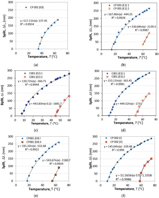 We now study the temperature dependence of the wavelength split Δλ(T). Figure 13a–e present the temperature dependences of the split of CP 001 before etching (E0) and after each consecutive etching (E1, …, E4) as well of grating CP 002 (Figure 13f). The Δλ(T) at lower (blue rhombs) and at higher (red squares) temperatures is shown. As we see from the figures, the Δλ(T) curves are very well fit by a logarithmic dependence in the form: