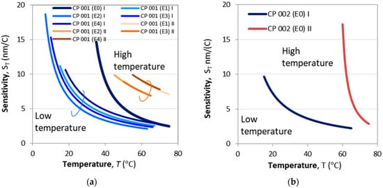 Figure 14a,b show the sensitivities at lower and higher temperature splits for CP 001 and CP 002 calculated using (22) and the fitting parameters from Figure 13a–f. The plots in Figure 14a show that the etching process basically does not change the dependence, but simply shifts along the temperature scale.