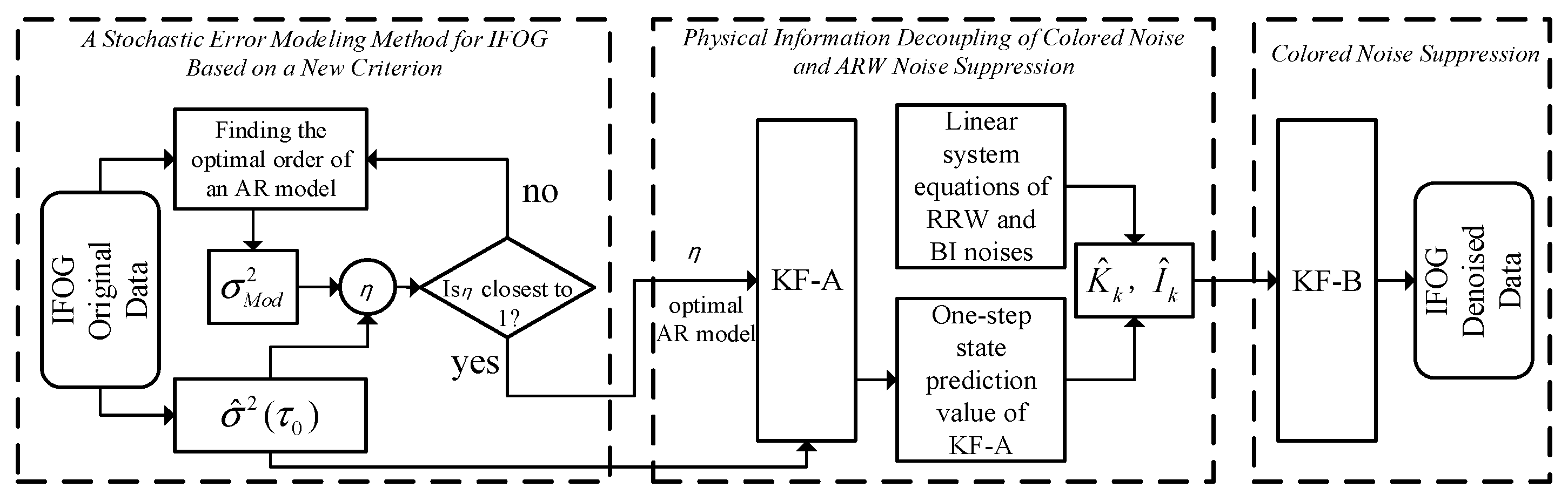 26]. Analysis can also indicate that, in addition to their respective shortcomings, the two traditional methods also have the same principled limitation, that is, they both perform permutations and combinations of multiple sub-models of different types, so as to establish a complete model that can best meet the pre-specified criteria. This leads to two problems: First, the random error model may change randomly (possibly being an AR model, an MA model, or an ARMA model), which fails to provide a consistent model format for the subsequent Kalman filtering process and thus drastically increases the design complexity of the filter. Second, the established model cannot truly reflect the error distribution characteristics of the IFOG. For example, both the AR terms and MA terms in the ARMA model simultaneously contain colored noise and white noise information. As a result, the Kalman filter based on the ARMA model cannot effectively separate different types of noise. Additionally, when the ARMA model is used as the system equation of the Kalman filter, if the order of the MA terms exceeds 1, there will be difficulties in state dimension expansion, which also limits the filtering accuracy of the Kalman filter.