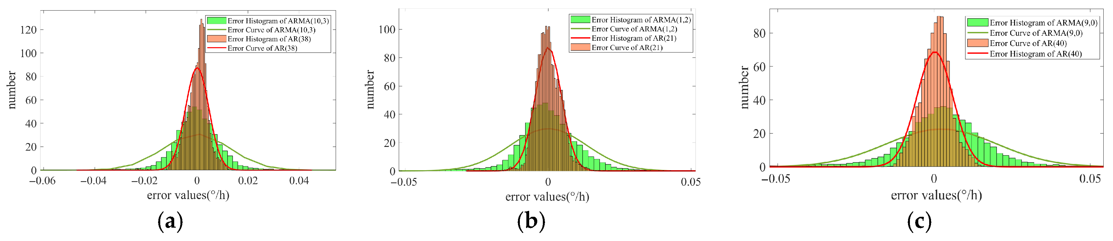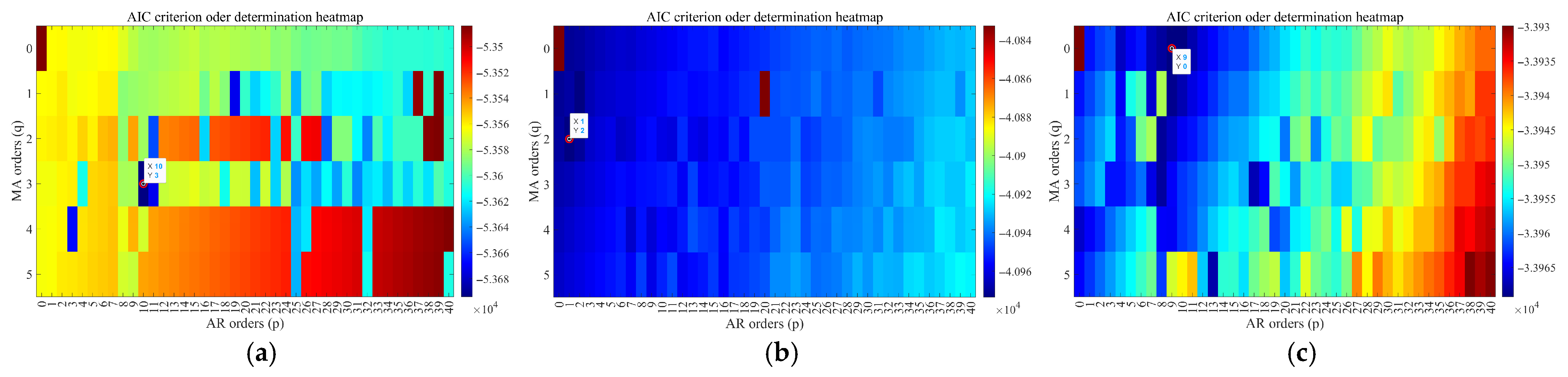 Figure 5a–c that, compared with the ARMA modeling method based on the AIC criterion, the pure AR modeling method proposed in this paper has a narrower error distribution interval. Meanwhile, the analysis of the data in