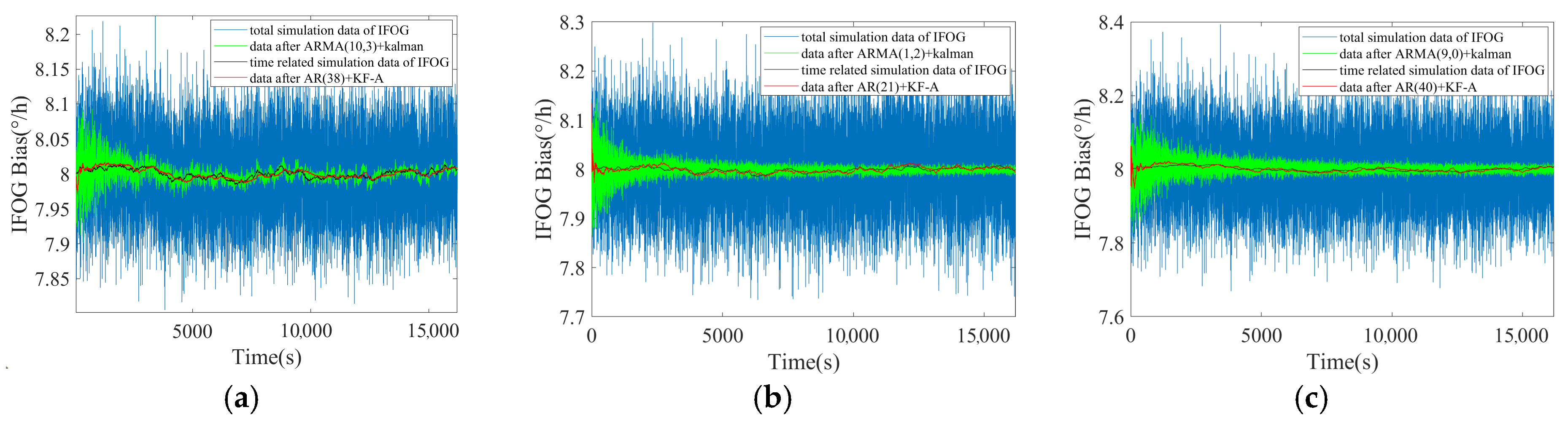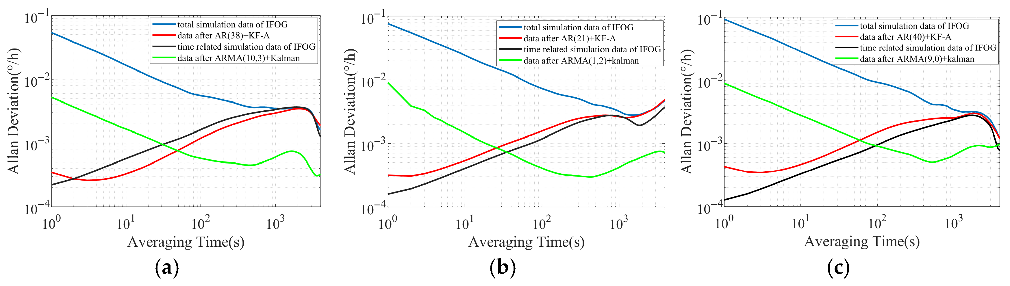 Figure 4a–c that the red Allan standard deviation curve and the black Allan standard deviation curve still maintain a high degree of consistency in trends at different time scales, and the −1/2 slope characteristic consistent with white noise in the red curve basically disappears, indicating that the “AR (p) + KF-A” method has a very effective suppression effect on the IFOG white noise. However, the green Allan standard deviation curve can be regarded as the result of the overall downward shift of the blue Allan standard deviation curve, and all slope characteristics in the blue curve are retained in the green curve, indicating that the suppression degree of the “ARMA (p, q) + Kalman” method on the IFOG noise is limited.