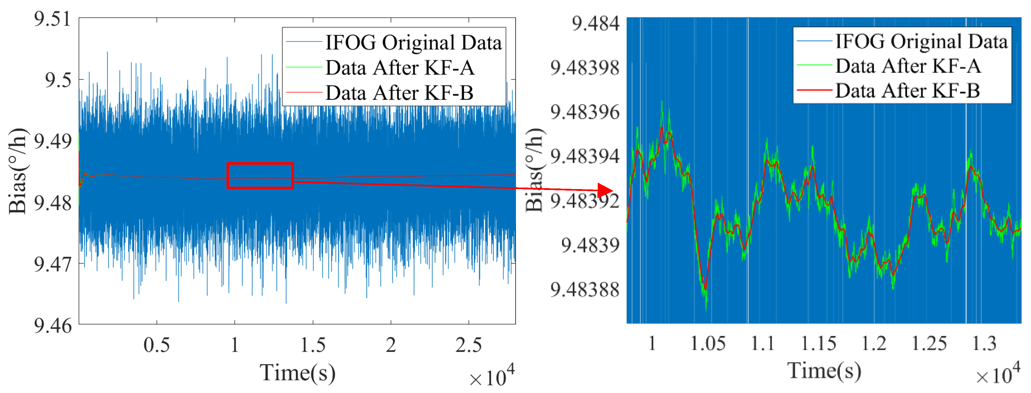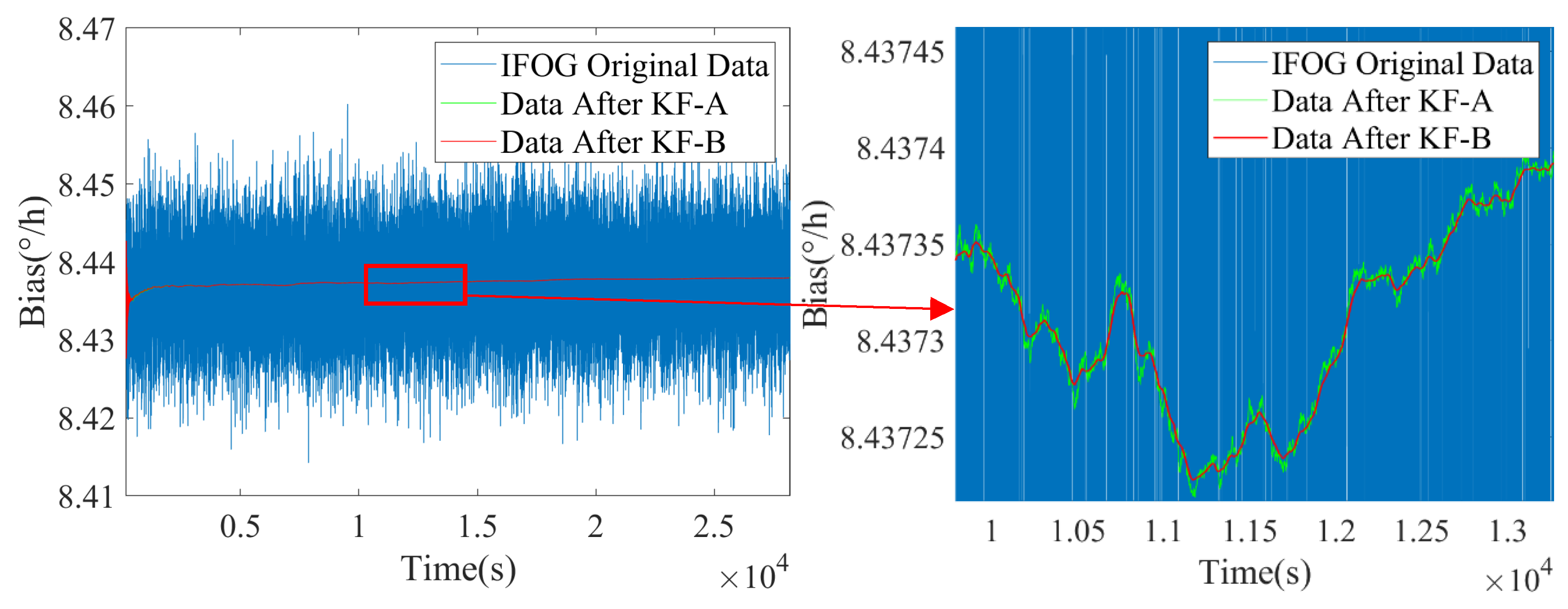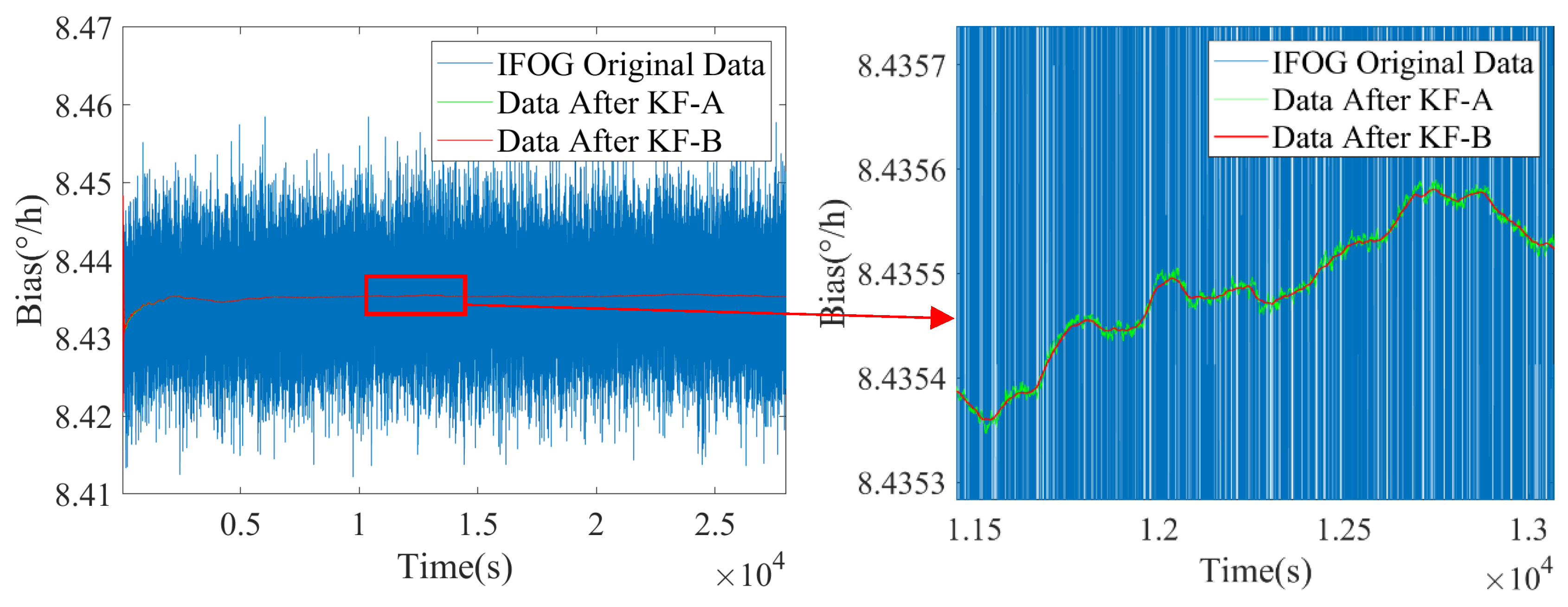 Figure 10, where the blue line represents the original IFOG data, the green line represents the IFOG data filtered by KF-A, and the red line represents the IFOG data filtered by KF-B. It can be seen from