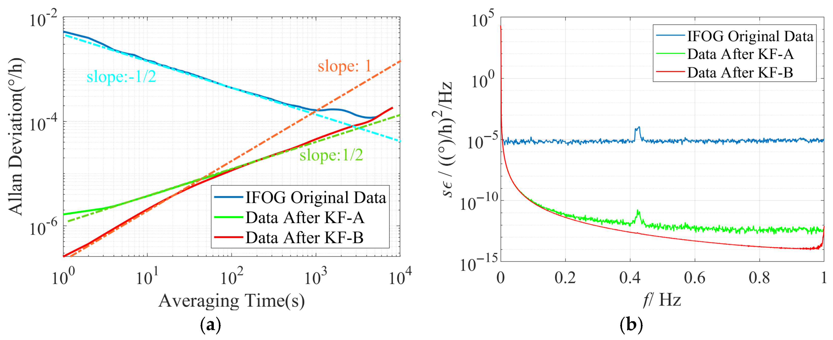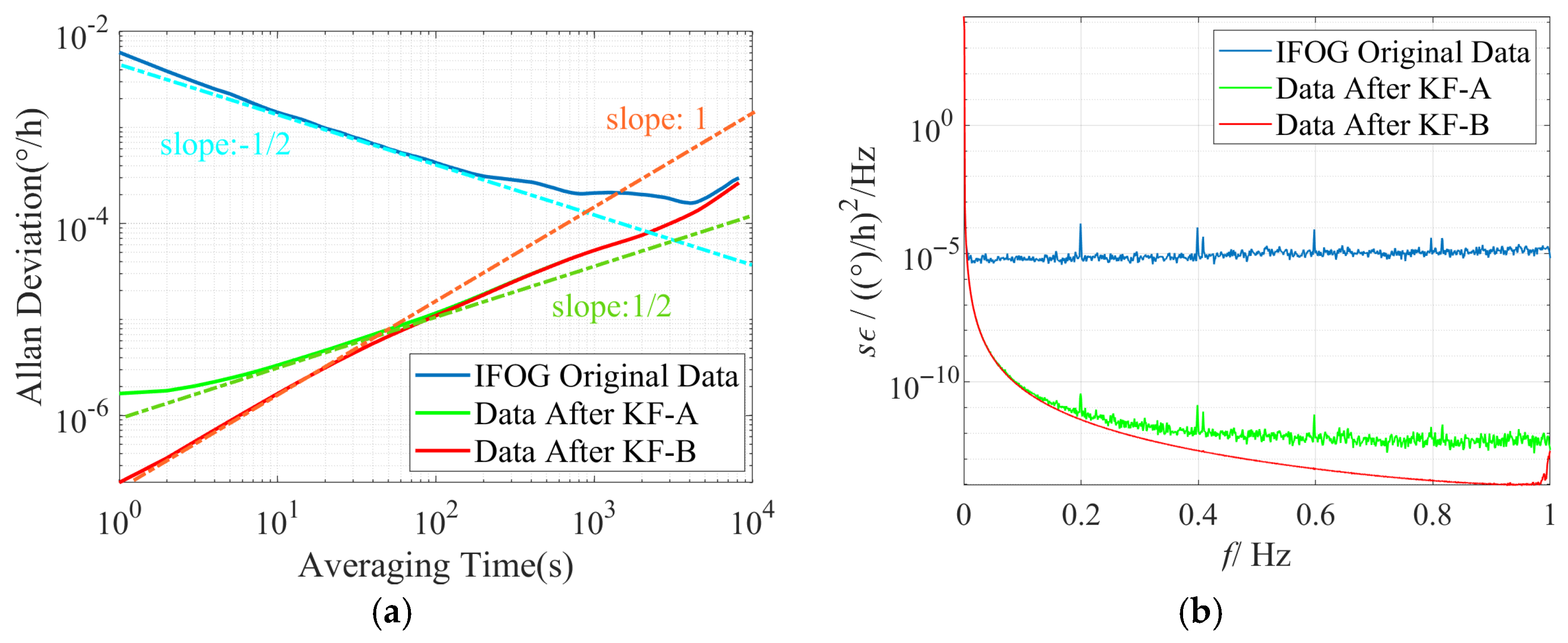 Figure 13b are observed, it can be seen that the original IFOG data is mainly composed of ARW error, and its corresponding PSD approximately exhibits a constant distribution (blue curve). The PSD curve of the data after KF-A filtering (green curve) shows typical power-law noise characteristics, with the power density in the medium and high-frequency bands reduced by more than 5 orders of magnitude compared with the original data. The PSD curve of the data after KF-B filtering (red curve) further reduces the medium and high-frequency power density by 1–2 orders of magnitude on the basis of the green curve. The above simulation and experimental results demonstrate the accuracy of the proposed method in modeling various noises in IFOG data and the effectiveness of noise suppression.