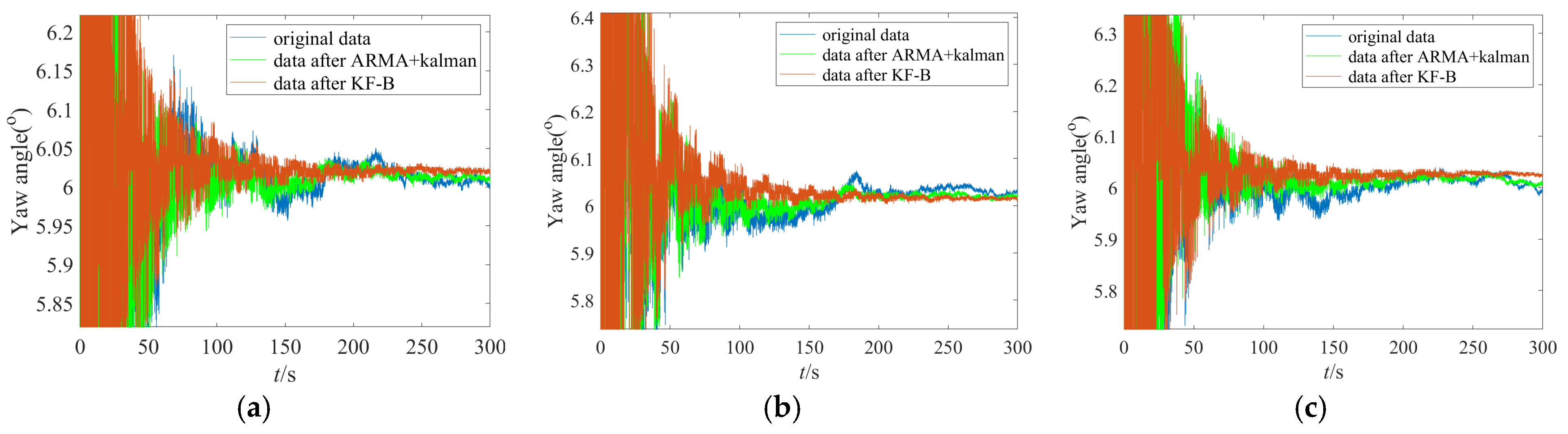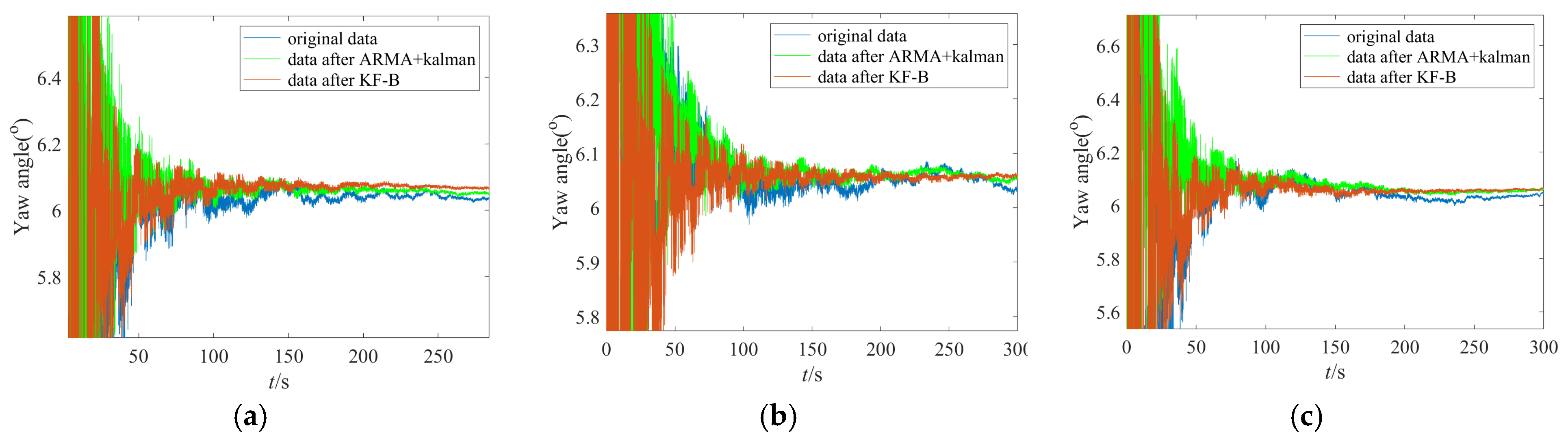 Table 6 shows the following: In the first group of initial alignment tests, the heading angle alignment accuracy based on the original IFOG data is 90.73″, that based on the data filtered by the “ARMA + Kalman” method is 57.65″, and that based on the data filtered by the “KF-B” method is 11.60″. The heading angle alignment accuracy of the proposed method in this paper is improved by 51% compared with the “ARMA + Kalman” method. In the second group of initial alignment tests, the heading angle alignment accuracy based on the original IFOG data is 33.50″, that based on the data filtered by the “ARMA + Kalman” method is 32.29″, and that based on the data filtered by the “KF-B” method is 17.21″. The heading angle alignment accuracy of the proposed method is improved by 45% compared with the “ARMA + Kalman” method.
