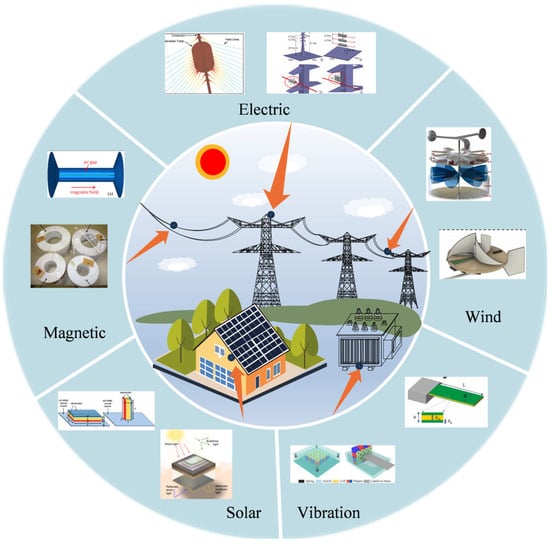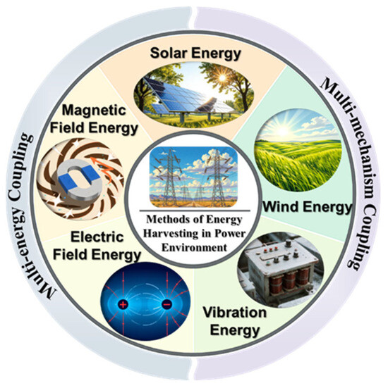Realizing in situ energy supply for sensors within the power environment through the collection of renewable energy present in that environment represents a disruptive technology in the new energy revolution [11,12,13,14,15]. At present, the energy harvesting technologies in the power environment mainly include magnetic field energy harvesting [16,17], electric field energy harvesting [18,19], vibration energy harvesting [20,21], wind energy harvesting [22,23], and solar energy harvesting [24,25], as shown in Figure 1. To systematically characterize these energy harvesting technologies, Table 1 presents a unified taxonomy based on two key dimensions: energy sources (e.g., magnetic, mechanical, and radiant) and conversion mechanisms (e.g., electromagnetic induction and the piezoelectric effect). This classification framework serves as a foundational structure for the subsequent analysis and discussion. This paper presents a comprehensive review of the current development status of energy harvesting technologies within the power environment. It outlines recent advancements in magnetic field energy harvesting, electric field energy harvesting, vibration energy harvesting, wind energy harvesting, and solar energy harvesting. Furthermore, it explores multi-physical mechanism coupling and multi-energy integration approaches in self-powered power systems and provides a comparative analysis of the advantages and limitations associated with each technology. Additionally, the paper discusses potential future directions for the development of energy harvesting technologies in power-related applications.