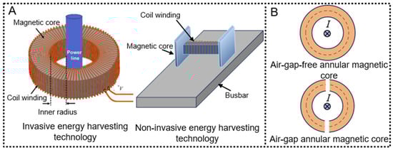 The core principle of direct conversion technology is grounded in Faraday’s law of electromagnetic induction. When a coil is exposed to a varying magnetic flux or when magnetoelectric materials are employed, an induced voltage is generated in response to changes in the magnetic field. This phenomenon enables the direct conversion of magnetic energy into electrical energy. Direct conversion technology can be categorized into two primary types according to the installation method of the energy harvesting module: invasive and non-invasive (Figure 2A). The fundamental distinction between these two lies in whether the original conductor needs to be physically disconnected, wound around, or internally embedded. Invasive energy harvesting operates in a manner similar to conventional current transformers, where energy is obtained through insertion-based coupling with transmission lines or AC buses. The invasive type can be further classified into two subcategories: cable-clamping configurations with and without an air gap ring core (Figure 2B).