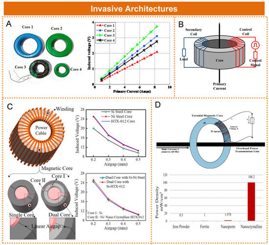 Invasive magnetic field energy harvesting architectures: (A) Architecture based on cable-clamping air-gapless toroidal magnetic core. Reprinted with permission from [31]. (B) Scheme introducing an artificial magnetic field. Reprinted with permission from [32]. (C) Architecture based on a cable-clamping toroidal double magnetic core with an air gap. Reprinted with permission from [33]. (D) Energy harvesting system utilizing toroidal magnetic core induction from overhead power lines. Reprinted with permission from [34].