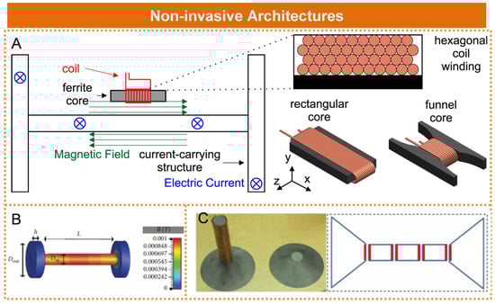 Non-invasive magnetic field energy harvesting architecture: (A) Collecting magnetic field energy from current-carrying structures. Reprinted with permission from [36]. (B) Independent I-type magnetic core. Reprinted with permission from [37]. (C) Bow-tie magnetic core structure. Reprinted with permission from [38].