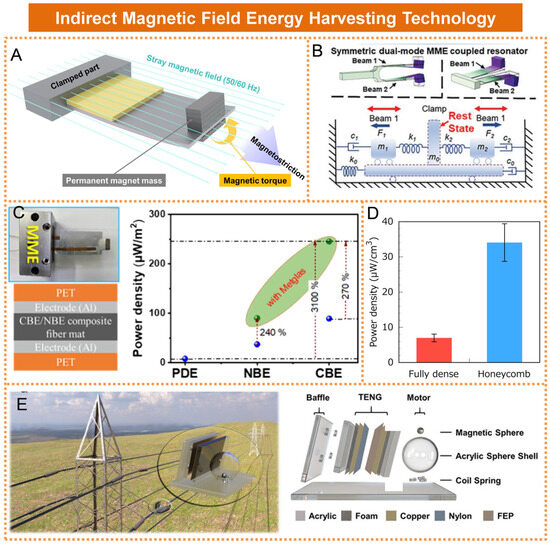 Indirect magnetic field energy harvesting technologies: (A) Magneto-electromechanical generator based on PZT-5H and Ni. Reprinted with permission from [46]. (B) Symmetric mechanical coupling dual-mode MME energy harvester. Reprinted with permission from [47]. (C) MME based on piezoelectric ferromagnetic (PVDF/BZT-BCT-ferrite) electrospun fiber composites. Reprinted with permission from [48]. (D) Output performance of honeycomb-structured, magnetostrictive Fe52-Co48 alloy. Reprinted with permission from [49]. (E) Triboelectric nanogenerator based on a rotating magnetic sphere. Reprinted with permission from [50].