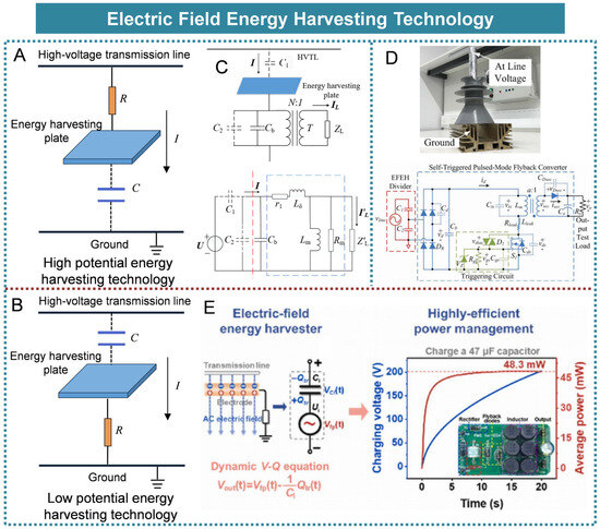 Electric field energy harvesting technologies: (A) High-potential energy harvesting method. (B) Low-potential energy harvesting method. (C) A method for collecting spatial electric field energy by utilizing the impedance conversion characteristics of transformers and the reactive power compensation characteristics of capacitors. Reprinted with permission from [59]. (D) A self-triggered pulsed-mode flyback converter for electric field energy harvesting. Reprinted with permission from [60]. (E) A scheme for maximizing energy transmission efficiency by managing charge transfer at peak voltage. Reprinted with permission from [61].
