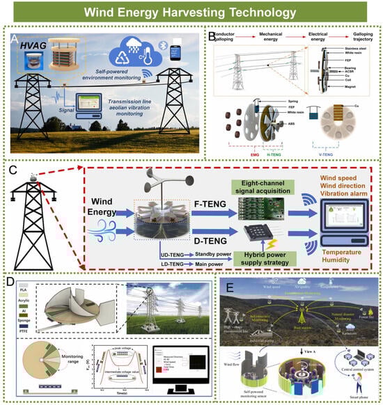 Wind energy harvesting technologies: (A) Triboelectric–electromagnetic hybrid wind energy harvesting system. Reprinted with permission from [81]. (B) Self-powered transmission line galloping monitoring system. Reprinted with permission from [82]. (C) Multi-directional and broadband wind energy harvesting device. Reprinted with permission from [83]. (D) Self-powered overhead line wind speed and direction acquisition system. Reprinted with permission from [84]. (E) Wind energy harvesting device with a self-regulating strategy. Reprinted with permission from [85].