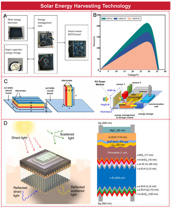 Solar energy harvesting technologies: (A) Self-powered intelligent sensing system for transmission lines based on solar energy. Reprinted with permission from [86]. (B) Transmission line equipment health status monitoring system based on self-powered sensors. Reprinted with permission from [87]. (C) Solar cell with a side wall light energy absorption function. Reprinted with permission from [88]. (D) Solar cell with light energy absorption function on both sides. Reprinted with permission from [89].