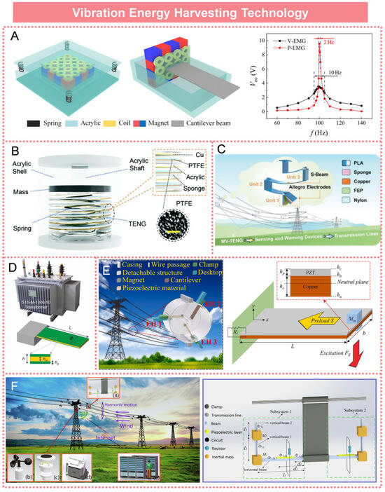 Vibration energy harvesting technologies: (A) Electromagnetic vibration energy harvesting device based on alternating magnet arrays. Reprinted with permission from [105]. (B) Self-powered sensing network based on triboelectric nanogenerator. Reprinted with permission from [106]. (C) Multimodal vibration triboelectric nanogenerator. Reprinted with permission from [107]. (D) Self-powered transformer temperature monitoring system. Reprinted with permission from [108]. (E) High-performance piezoelectric vibration energy harvester. Reprinted with permission from [109]. (F) Novel broadband piezoelectric energy harvester based on internal resonance. Reprinted with permission from [110].