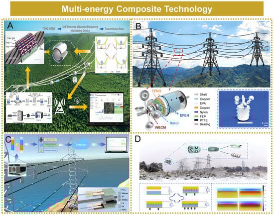 Zhijie Hao et al. developed a self-powered grid vibration frequency monitoring device utilizing triboelectric nanogenerators and micro thermoelectric generators [111]. A vibration frequency sensing model based on triboelectric generation and an energy harvesting model based on thermoelectric generation were constructed, as illustrated in Figure 10A. The experimental results indicated that within the frequency range of 0.1 to 5.1 Hz, the triboelectric nanogenerator can accurately detect the vibration frequency of transmission lines, with a maximum measurement error of 1.274%. Additionally, the thermoelectric generator achieved a maximum open-circuit voltage of 3.282 V. Xiaolong Huang et al. developed a triboelectric–electrostatic hybrid energy harvester by integrating a triboelectric nanogenerator with an electric field energy harvester [112], enabling the simultaneous capture of wind energy and ambient electric field energy near transmission lines, as illustrated in Figure 10B. The wind energy harvesting component achieved an output power of 14.3 mW, while the electric field energy harvesting component delivered an output power of 28.9 mW. Xing Feng et al. proposed a hybrid energy harvesting approach that integrated a micro thermoelectric generator with a triboelectric nanogenerator [113] and developed a corresponding theoretical model for the hybrid system, as illustrated in Figure 10C. The prototype was capable of not only capturing energy from the vibration of transmission lines but also converting the thermal energy generated by the lines into electrical energy. Experimental results demonstrated that the hybrid energy harvesting device achieved a 5.36% improvement in both energy harvesting efficiency and battery charging performance. Yingli Lu et al. proposed a self-powered monitoring system for assessing both the thickness and growth kinetics of ice accumulation on transmission lines, utilizing a triboelectric nanogenerator (TENG) and a micro thermoelectric generator (MTEG) [114], as illustrated in Figure 10D. Experimental results indicated that the triboelectric generation module was capable of accurately measuring ice layer thickness within the range of 10 mm to 20 mm, with a maximum measurement error of only 2.14%. Furthermore, it effectively monitored ice growth rates ranging from 0.02 mms−1 to 1 mms−1, exhibiting a maximum error of 3.65%. The thermoelectric generation unit achieved a peak output voltage of 1.15 V and a maximum current of 180 mA.