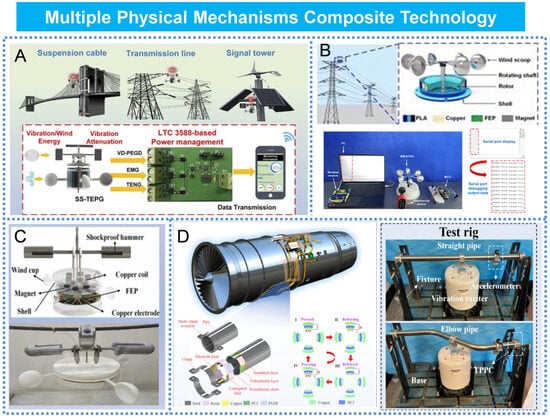Composite of multiple physical mechanisms: (A) Triboelectric–electromagnetic-piezoelectric composite. Reprinted with permission from [121]. (B) Triboelectric–electromagnetic composite. Reprinted with permission from [122]. (C) Triboelectric–electromagnetic composite. Reprinted with permission from [123]. (D) Triboelectric–piezoelectric composite. Reprinted with permission from [124].