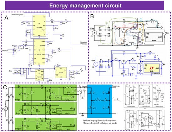 Energy management circuit: (A) Scheme of the hybrid energy management circuitry. Reprinted with permission from [125]. (B) UVLO circuit design. Reprinted with permission from [126]. (C) Cascade ladder-type energy conversion circuit. Note: HFCC: High-frequency control circuit; LFCC: Low-frequency control circuit. Reprinted with permission from [63].