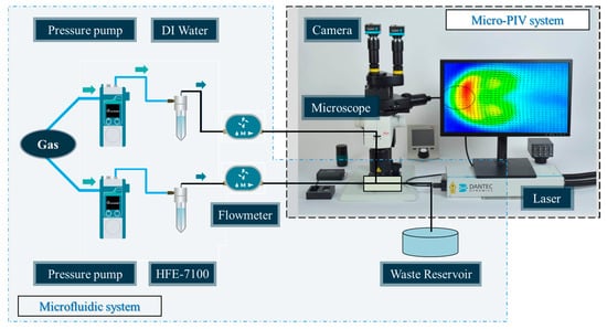 The experimental setup includes microfluidic and Micro-PIV systems, and its arrangement is shown in Figure 2. The deionized water (DI water, Macklin) and hydrofluoroether (HFE-7100, 3M, St. Paul, MN, USA) are used as the dispersed and continuous fluids, respectively, and their physical properties are given in Table 1. Moreover, the fluorescent tracing microparticles with a particle diameter of 2 μm and an excitation wavelength of 535 nm (FluoSpheres 535/575, Thermo Fisher Scientific, Waltham, MA, USA) are added to DI water to track the flow velocity in Micro-PIV experiments, and the particle concentration is 0.05% w/v. The microstructures with a relatively lower particle concentration have less effect on the viscoelastic properties and surface tension, which has been investigated in the previous work [55]. The immiscible two-phase fluids are driven into microfluidic chips using two independent pressure pumps (Flow EZ, Fluigent, Le Kremlin-Bicêtre, France), and the flow rate of each fluid is measured by two separate flowmeters (Flow UNIT-M, Fluigent, France). All the units of the flow rate are μL/min. The pressure pumps and flowmeters are controlled by OxyGEN Software (version 2.3.2, Fluigent, France).