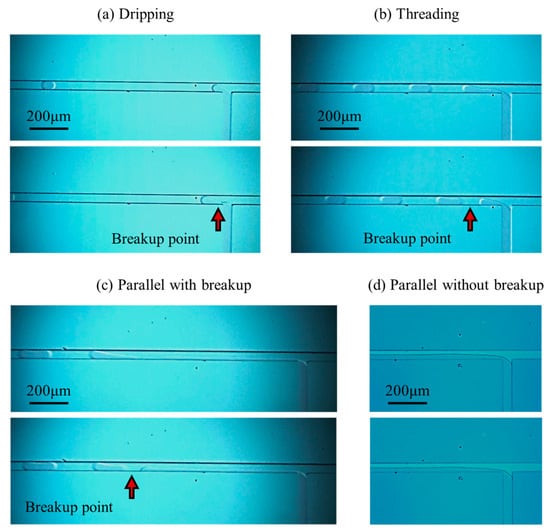 Generally, the flow regimes in T-junction microchannels are classified as dripping regime, threading regime, and parallel flow regime [25,27]. However, the microchannel width in the present work is smaller than that in past studies. Owing to the boundary layer effect, the interface of the dispersed fluid in the parallel flow regime is induced to break up, leading to the observation of two distinct flow patterns within this regime: a breakup pattern and a non-breakup pattern. The observed flow regimes and their corresponding patterns in the present experiment are illustrated in Figure 3.