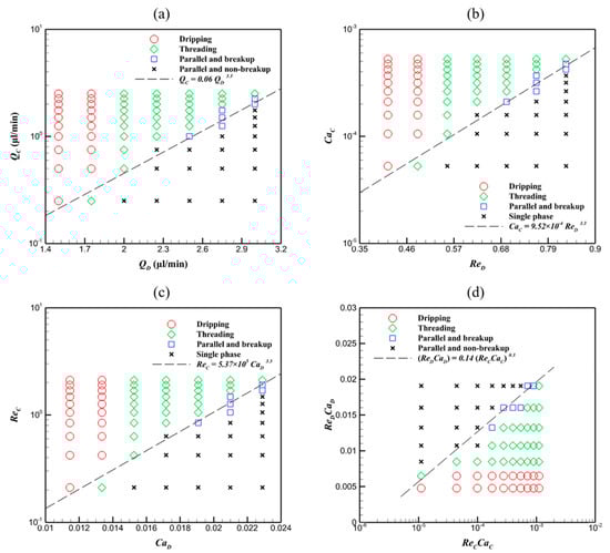 Figure 4. Flow regime map in the T-junction microchannel showing the correlation between (a) QDQC, (b) ReDCaC, (c) CaDReC, and (d) ReCCaCReDCaD.