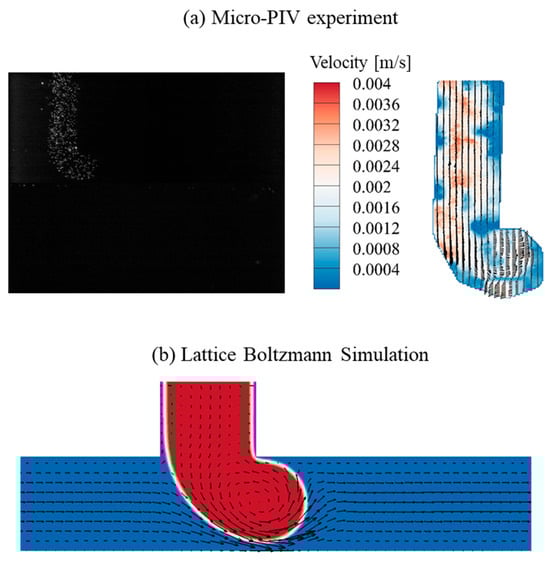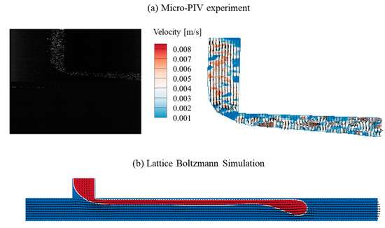 For the threading regime (QC = 1.0 μL/min, QD = 2.0 μL/min), the interface shape and flow field are characterized in Figure 6. The corresponding dimensionless numbers are ReC = 0.843, CaC = 2.11 × 10−4, ReD = 0.555, and CaD = 1.53 × 10−2, respectively. The DI water interface exhibits an L-shape, similar to that in the dripping regime, but the DI water head elongates under the enhanced hydrodynamic interaction at a higher flow rate of dispersed fluid. Both the Micro-PIV experiment and lattice Boltzmann simulation demonstrate that there is no obvious vortex in the threading regime. Compared with Figure 5a, a visible boundary between DI water and HFE-7100 is observed in the microchannel of the dispersed fluid. This boundary and the gooseneck-like thin layer of DI water are deformed by the balance between the hydrodynamic forces of HFE-7100 flow and the surface tension force of DI water, governing the transition from dripping to threading regimes. The DI water forms a head structure ahead of the gooseneck-like thin layer, which is subsequently squeezed and sheared by the HFE-7100 flow, leading to the generation of microdroplets.
