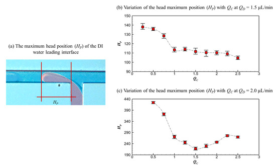 Figure 8. The maximum head position (HP) of the DI water leading interface at the farthest advancement: (a) schematic diagram, (b) HP varies with QC at QD = 1.5 μL/min, and (c) HP varies with QC at QD = 2.0 μL/min.
