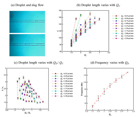 Figure 10. The properties of microdroplets generated in the T-junction microchannel: (a) droplet flow pattern, (b) droplet length varies with QC, (c) dimensionless droplet length varies with the ratio of flow rate QD / QC, and (d) frequency varies with QD.