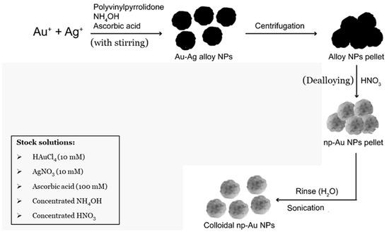 We first started by aiming to make a final volume of 10 mL. First, 0.2 g of PVP (2% of PVP (weight of PVP in grams/total volume in mL)) for the 10 mL final volume (to make a final PVP concentration of 0.5 mM), was dissolved in 9 mL of Milli-Q water in a 20 mL scintillation vial with continuous stirring using aqua regia-cleaned magnets. After the complete dissolution of the PVP, 50 μL of concentrated NH4OH (0.5% v/v) was added to the vial. Afterwards, 125 μL of 10 mM gold (III) chloride and 375 μL of 10 mM silver nitrate solution (total volume of gold (III) chloride and silver nitrate was 5% (v/v)) were added to the vial simultaneously in order to make a Au:Ag molar ratio of 1:3. Immediately following this, 450 μL of 100 mM L-ascorbic acid (4.5% v/v) was added to the solution. A change in the color of the solution from colorless to reddish brown indicated the formation of gold/silver (Au/Ag) alloy nanoparticles, which was later confirmed by scanning electron microscopy (SEM). The Au/Ag alloy nanoparticles were then washed with Milli-Q water using repeated centrifugations at 5000 r.p.m. for 5 min. Finally, the alloy nanoparticles were dealloyed using concentrated nitric acid to form nanoporous gold nanoparticles (np-AuNPs), washed multiples times with Milli-Q water, redispersed in Milli-Q water using sonication, and stored at 4–8 °C for long-term stability. The final volume was scaled up and no issues were observed up to a volume of 1 L. A general representation of this method is illustrated in Figure 1.