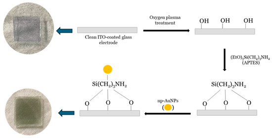 The working electrode was prepared by modifying an indium tin oxide (ITO)-coated glass electrode with nanoporous gold nanoparticles (np-AuNPs). The ITO-coated glass was first cut into approximately 1 × 1 cm2 pieces and thoroughly cleaned using Milli-Q water and ethanol, each with sonication repeated at least three times. After cleaning, the electrodes were dried with nitrogen (N2) gas and then treated with oxygen (O2) plasma for a minimum of 15 min to enhance the surface oxygen species, such as hydroxyl (-OH) groups, and to remove organic contaminants. The electrodes were subsequently immersed in a 1% (v/v) APTES solution in ethanol for at least one hour. Following this, they were rinsed with ethanol and Milli-Q water to eliminate any loosely bound materials and dried again under a nitrogen flow. Finally, np-AuNPs were drop-casted onto the APTES-functionalized ITO-coated electrodes and left overnight in a covered fume hood to allow for immobilization. This process yielded np-AuNPs-modified ITO-coated glass electrodes. The process is illustrated in Figure 2.
