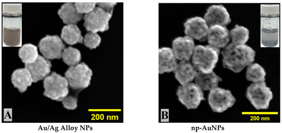 The gold (III) and silver (I) ions were co-reduced by ascorbic acid to their respective metals, from which the alloy nanoparticles were formed in the form of their interconnected ligament structure. During the dealloying process, the silver (Ag) was selectively removed from the alloy, leading to the formation of pores inside ligaments of gold (Au). Nanoporous gold nanoparticles (np-AuNPs) were successfully formed with the ligaments and pores clearly visible inside the nanoparticles through SEM imaging (Figure 3). The SEM images of alloy nanoparticles and nanoporous gold nanoparticles (np-AuNPs) are shown in Figure 3. The images in the inset are the real images of these colloidal nanoparticles in solution form. The SEM analysis further shows that these alloy and nanoporous nanoparticles possess a rough surface morphology with almost spherical shapes.