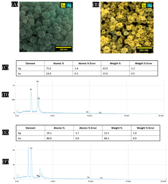 SEM/EDS analysis of Au/Ag alloy nanoparticles and nanoporous gold nanoparticles (np-AuNPs). (A,B) are color SEM images of the alloy nanoparticles and np-AuNPs, respectively; (C) and (D) show the elemental composition and EDS spectra of the alloy nanoparticles, respectively; and (E,F) show the elemental composition and EDS spectra of the np-AuNPs.