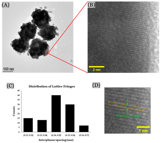 High-resolution TEM images: (A) TEM image of Au/Ag alloy nanoparticles, (B) magnified view, and (C) histogram showing distribution of interplanar spacing between lattice fringes (ImageJ software), and (D) zoomed view showing interplanar spacing.