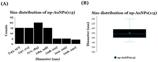 DLS data showing size distribution of np-AuNPs(1:3): (A) histogram and (B) box plot.