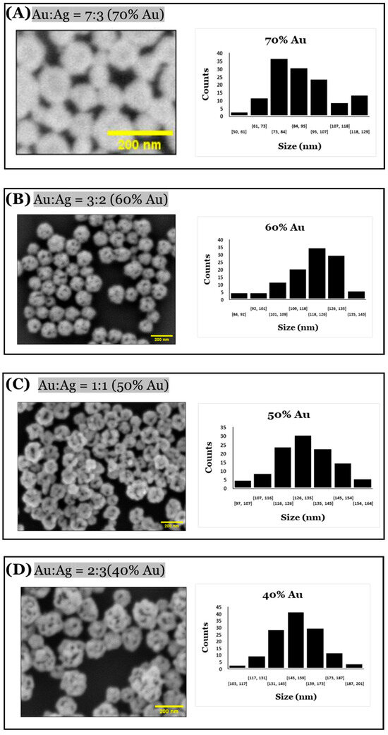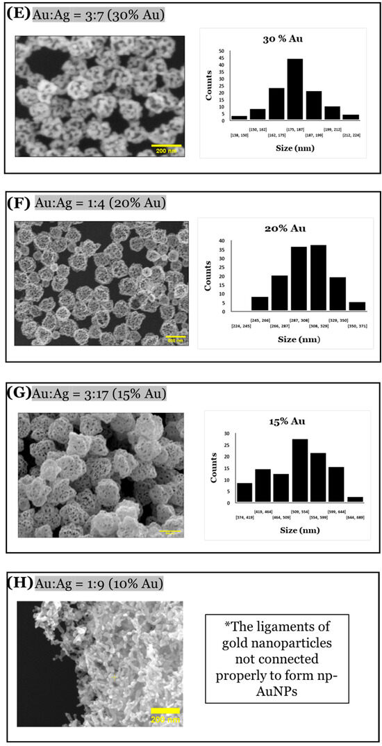 SEM images of np-AuNPs formed using different Au:Ag ratios and histograms showing their respective size distributions. The numbers under each bar in the bar charts represent ranges of dimensions in nm, and counts is the number of observed pores in that range.