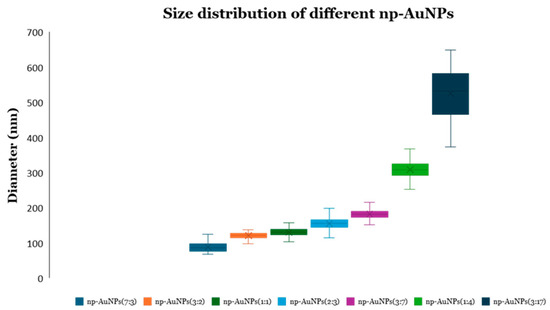 Box plot showing the size distributions of various np-AuNPs. The ratios in parentheses specify the Au:Ag ratio from which the alloy nanoparticles were prepared.