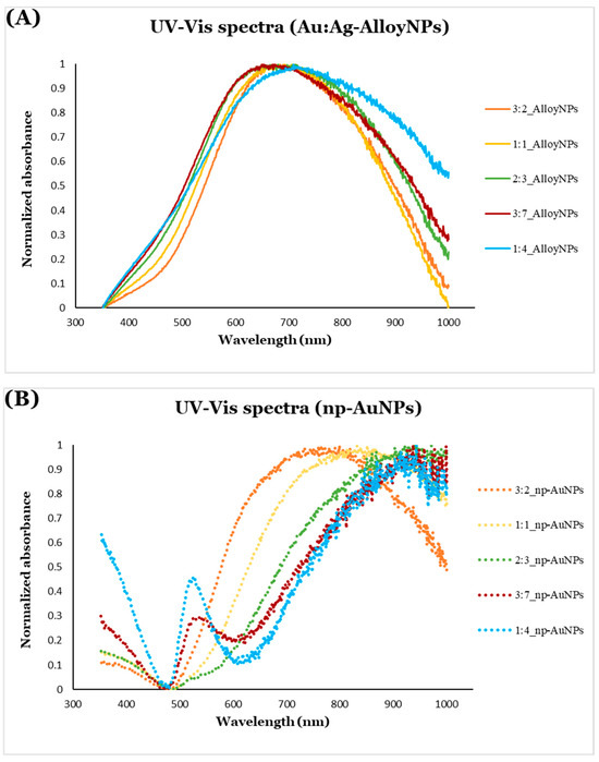 In contrast, a more pronounced red shift is seen for the np-AuNPs (dotted lines in Figure 12B) compared to the alloy nanoparticles. The extinction peaks of the np-AuNPs are in the near-infrared (NIR) region (around 750 nm to 1000 nm). A significant, gradual red shift is observed for the np-AuNPs as their size increases, which can be attributed to the broader open pore structures in the np-AuNPs compared to the solid packed arrangement in the alloy nanoparticles. Interestingly, larger np-AuNPs also exhibit additional absorption peaks near 525 nm, a feature almost absent in smaller np-AuNPs. It is possible that these peaks represent localized surface plasmon absorbance due to the internal structure of gold ligaments that varies with the particle size. Smaller np-AuNPs have smaller pores and a more tightly packed ligament structure, while larger np-AuNPs feature larger pores and a more open ligament structure, which may account for the absorption peak around 525 nm that is typical of Au nanoparticles or the transverse mode of Au nanorods. This effect is particularly noticeable in the larger particles, such as those with Au:Ag molar ratios of 3:7 and 1:4, likely due to their open ligament structures. This indicates that the larger np-AuNPs exhibit surface plasmon resonance in both the visible and NIR regions, offering an additional advantage due to their open pore structures and larger surface area.