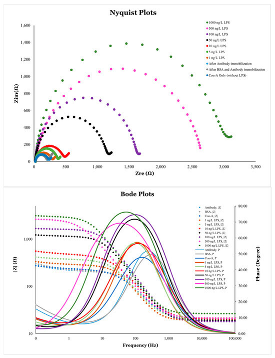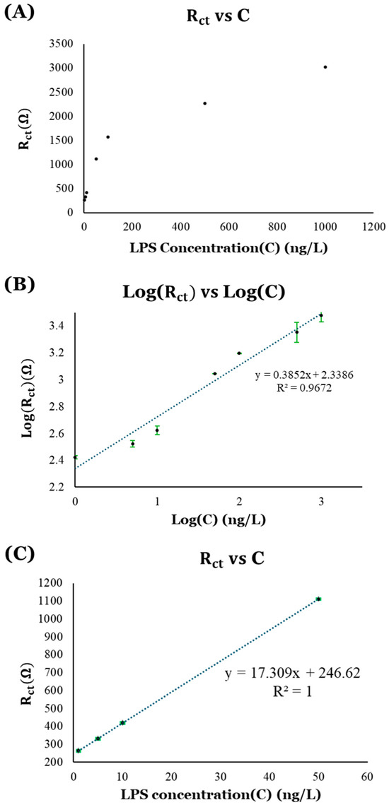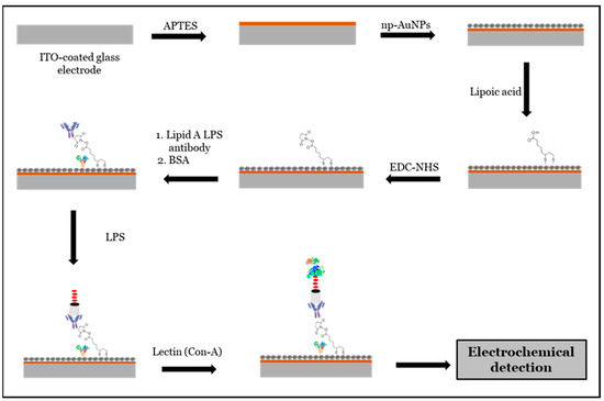 In this approach, a clean ITO-coated glass electrode surface was initially treated with (3-aminopropyl)triethoxysilane (APTES) to enable the attachment of nanoporous gold nanoparticles (np-AuNPs). After modifying the electrode with np-AuNPs, it was further functionalized with lipoic acid, followed by EDC-NHS chemistry to immobilize a layer of lipid A LPS polyclonal antibodies, which specifically recognize the lipid A region of LPS. Bovine serum albumin (BSA) was used to prevent the non-specific binding of the antibodies. To enhance the electrochemical signal, concanavalin A (Con A), a lectin with a high affinity for carbohydrate structures, was introduced to bind to the carbohydrate components of LPS, forming a sandwich-type assay. Detection of LPS was then carried out using electrochemical impedance spectroscopy (EIS). A schematic illustration of this proposed LPS biosensing route is shown in Figure 13.