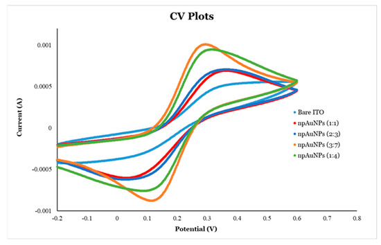 Cyclic voltammetry (CV) was employed to analyze the surface properties of ITO-coated glass electrodes modified with nanoporous gold nanoparticles (np-AuNPs). The measurements were conducted using a PARSTAT 2273 potentiostat/galvanostat (Princeton Applied Research, Oak Ridge, TN, USA; currently under AMETEK Scientific Instruments). A three-electrode configuration was utilized, comprising the modified electrode as the working electrode, an Ag/AgCl reference electrode, and a platinum wire counter electrode. The redox couple Fe(CN)64−/3− at pH 7.2 served as the electrochemical probe. The CV scans were carried out over a potential range from −0.2 V to +0.6 V at a scan rate of 0.1 V/s and a pulse amplitude of 5 mV.
