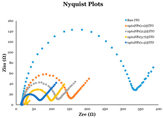 Various electrochemical techniques are available to investigate the surface characteristics of modified electrodes, offering valuable information about their behavior and properties. Cyclic voltammetry (CV) and electrochemical impedance spectroscopy (EIS) are among the most widely used techniques. These techniques provide insights into redox reactions, charge/electron transfer mechanisms, diffusion processes, and other electrochemical phenomena at the electrode/electrolyte interface. In this study, CV and EIS were employed to examine the redox behavior and charge transfer processes on ITO-coated glass electrodes modified with nanoporous gold nanoparticles (np-AuNPs).