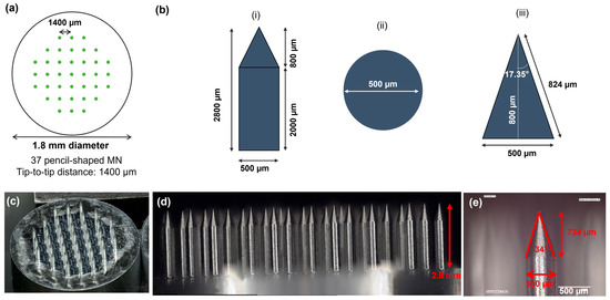 Dextran-methacrylate (Dex-MA)-based MNAs were fabricated according to a molding-evaporation process according to the classical literature procedures [36], as described in Figure 2a. An aluminum master comprising 37 pencil-shaped microneedles with a center-to-center spacing (pitch) of 1.4 mm, a height of 2.8 mm, and a base diameter of 500 µm was machined and subsequently used to fabricate polydimethylsiloxane (PDMS) negative molds.