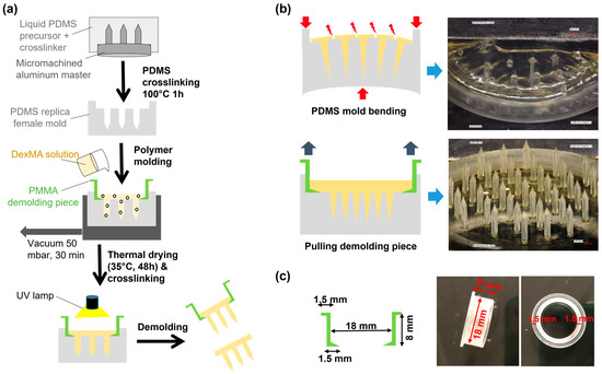 Fabrication of dextran-methacrylate (Dex-MA) MNAs with high MNs. (a) Schematic flow of the fabrication process with the preparation of the polydimethylsiloxane (PDMS) mold, polymer molding, drying, UV crosslinking, and demolding. (b) Details of the demolding step without (top images) and with (bottom images) a poly(methyl methacrylate) (PMMA) demolding piece. (c) Design and photographs of the PMMA demolding piece.