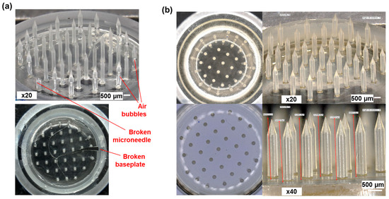 Optimization of the polymer formulation for the fabrication of Dex-MA MNAs with high microneedles. (a) Molding of MNAs using Dex-MA/LAP formulation (Dex-MA 20% w/v, LAP 1% w/v, in distillated water). (b) Molding of MNAs using Dex-MA/LAP/sorbitol formulation (Dex-MA 20% w/v, LAP 1% w/v, sorbitol 5% w/v, in distillated water).