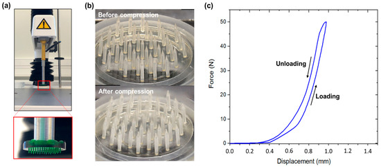Mechanical characterization of Dex-MA MNAs with high microneedles. (a) Photograph of the experiment test with the MNA attached to the texturometer probe being compressed onto a steel plate. (b) Digital microscope images of a MNA before and after compression. (c) Force = f(displacement) curve during loading and unloading.