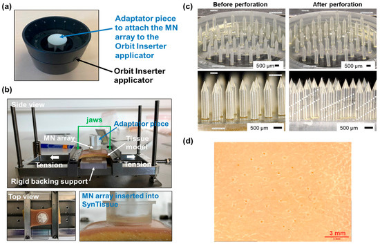 Perforation of human skin model. (a) Photograph of the Orbit Inserter assembled with the adaptation piece to attach the MNA. (b) Photographs of the perforation bench mounted with SynTissue after application of an MNA. (c). Digital microscopy images of a Dex-MA MNA before and after 2 min insertion in SynTissue. (d) Digital microscopy image of SynTissue after the insertion of a Dex-MA MNA.