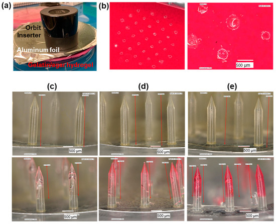Fluid uptake in gelatin/agar hydrogel model. (a) Photograph of the insertion of a MNA into the skin phantom with the use of the Orbit Inserter. (b) Digital microscopy images of the gelatin/agar hydrogel after 15 min application of an MNA. (c–e) Digital microscopy images of the MNAs before (top) and after (bottom) insertion into and retrieval from the gelatin/agar hydrogel after 15 min (c), 3 h (d), and 24 h (e) of application.