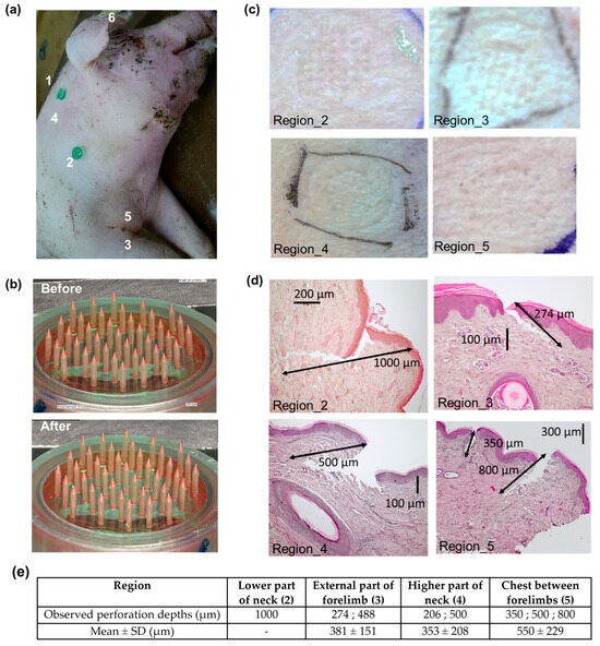 Porcine skin perforation experiments. (a) Photograph of the animal and the different regions where perforation was tested: right side of the neck behind the ear (1), lower part of the neck (2), external part of the right forelimb (3), higher part of the neck (4), chest between the two forelimbs (5), and inner surface of the ear (6). (b) Digital microscopy images of a MNA before and after insertion. (c) Photographs of different regions of skin after MNA removal. (d) Histology images of skin samples collected from different regions after MNA insertion. (e) Perforation depth measurements issued from histology images.